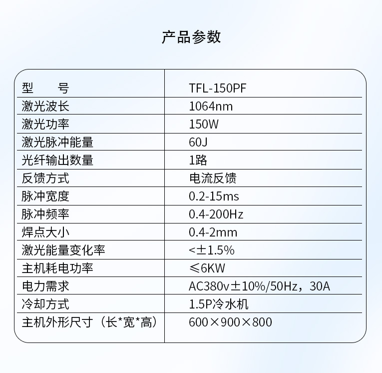 通發(fā)激光TFL-150PF光纖激光焊接機,采用能量反饋控制模式,能量較穩(wěn)定,光纖傳輸光束質(zhì)量好,適合0.5mm以下金屬不銹鋼板材的精密激光焊接,是批量五金產(chǎn)品中小功率焊接專用機型。