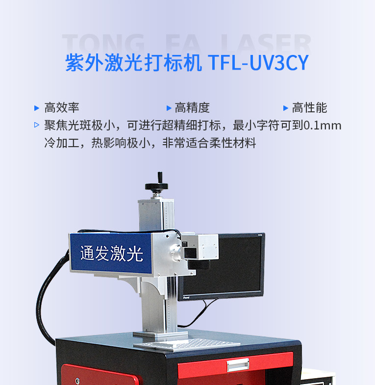 通發(fā)紫外激光打標(biāo)機(jī)聚焦光斑極小,可進(jìn)行超精細(xì)打標(biāo),最小字符可到0.1MM,冷加工,熱影響極小,不會有明顯燒痕,非常適合柔性材料、玻璃PCB標(biāo)識、特殊材料等高品質(zhì)打標(biāo)加工