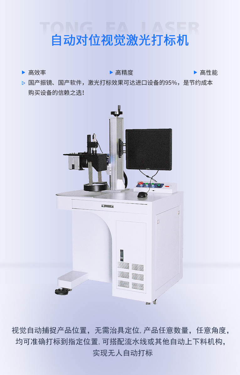 通發(fā)激光研發(fā)的自動對位視覺激光打標(biāo)機TFL-F20CY-ZD,視覺自動捕捉產(chǎn)品位置,無需治具定位,產(chǎn)品任意數(shù)量,任意角度,均可準確打標(biāo)到指定位置,可搭配流水線或其他自動上下料機構(gòu),節(jié)省人力,實現(xiàn)無人自動打標(biāo),可搭配流水線或其他自動上下料機構(gòu),節(jié)省人力,實現(xiàn)無人自動打標(biāo),極高的重復(fù)頻率,打標(biāo)速度快;極高的光學(xué)質(zhì)量,實現(xiàn)精細打標(biāo),可與光纖、CO2、半導(dǎo)體等各種波長的激光光路集成.