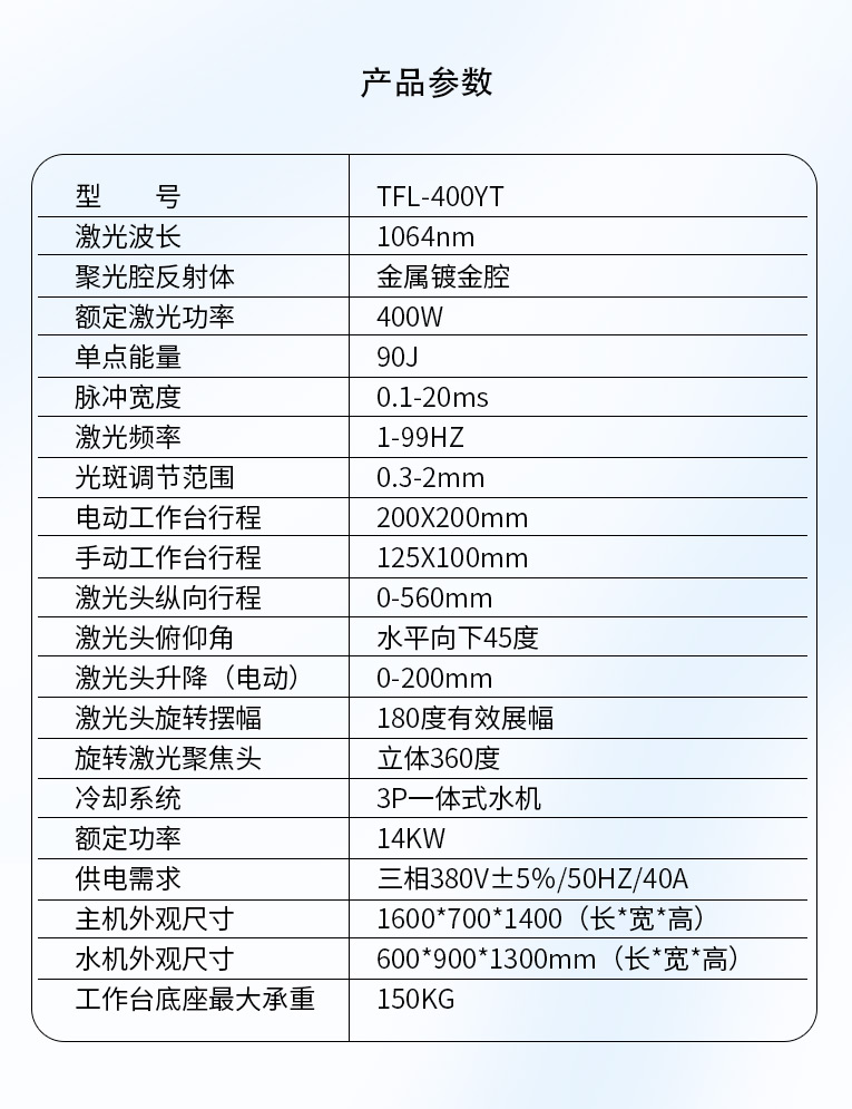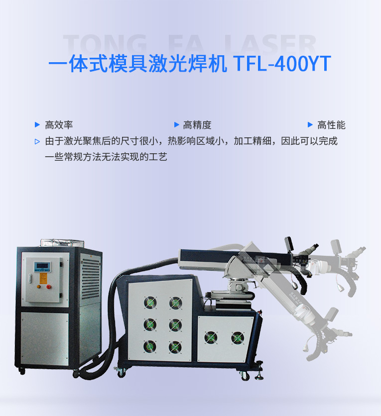通發(fā)激光一體式模具激光焊機TFL-400YT是一款多種功能融合一體的新型模具激光焊接機,針對特大型塑料模具激光焊、中型注塑模具激光燒焊、小型塑膠模具激光補焊、壓鑄模激光補焊具等各類模具可實現(xiàn)超精密修復,幫您解決大型汽車模具修復難題,不需要模具移動,電動工作臺與立體旋轉(zhuǎn)激光頭完美結(jié)合,操作桿控制運動移動實現(xiàn)輕松激光修復大型模具,同時也保留了傳統(tǒng)手動工作臺超精密修復模具功能。