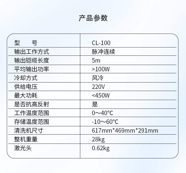 清洗機手持激光頭外觀簡潔、小巧輕便,可以長時間手持使用,按鍵與手柄一體化設計,簡單易用。內(nèi)置掃描系統(tǒng)采用小型高速電機及驅(qū)動 ,主體為一體化加工成型,堅固防塵且穩(wěn)定耐用。激光頭采用了創(chuàng)新的紅光輔助尋焦設計,可利用紅光指示輕松找到不同場 鏡下的對焦位置,解決了市場上現(xiàn)有產(chǎn)品對焦不準確以及調(diào)節(jié)方式單一的問題。