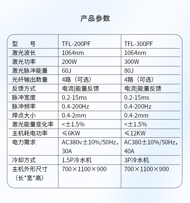 TFL-200PF/300PF光纖激光焊機是一款高穩(wěn)定性、中功率的光纖激光焊機,滿足長時間生產的需要。大功率激光電源,大功率散熱系統(tǒng)滿足24小時大批量生立。機身采用高強度結構,保證精度、性能穩(wěn)定。焊接控制系統(tǒng)是專為激光焊接度身定做的專業(yè)4軸控制系統(tǒng),穩(wěn)定性高,易學易懂易上手。擴展性強,可結合流水線、光電傳感器、氣動夾具等組合進行全自動無人值守式加工??蛇M行時間分光或能量分光,適合不同加工的場合的應用,多工位加工應用,可以廣泛應用在點焊、連續(xù)焊及柔性加工需求行業(yè)等激光焊接。